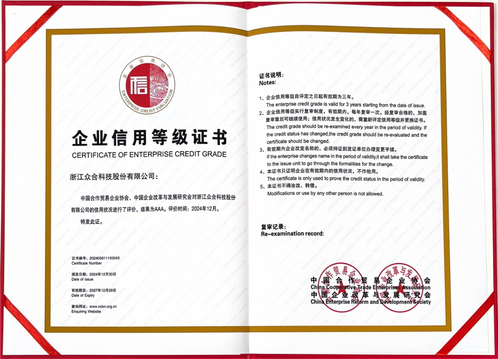 在新一輪科技革命與產業變革浪潮中,誠信經營是企業長久生存與發展的根基,亦是立于不敗之地的核心。長久以來,眾合科技始終嚴格履約踐諾,將誠信理念貫穿在營銷、管理、生產等各個環節,憑借健全的信用管理體系、優良的合同履約信用狀況和良好的市場信譽,榮獲了“2023年浙江省AAA級守合同重信用企業”等榮譽,展現了公司在推動行業信用體系建設中的卓越表現。